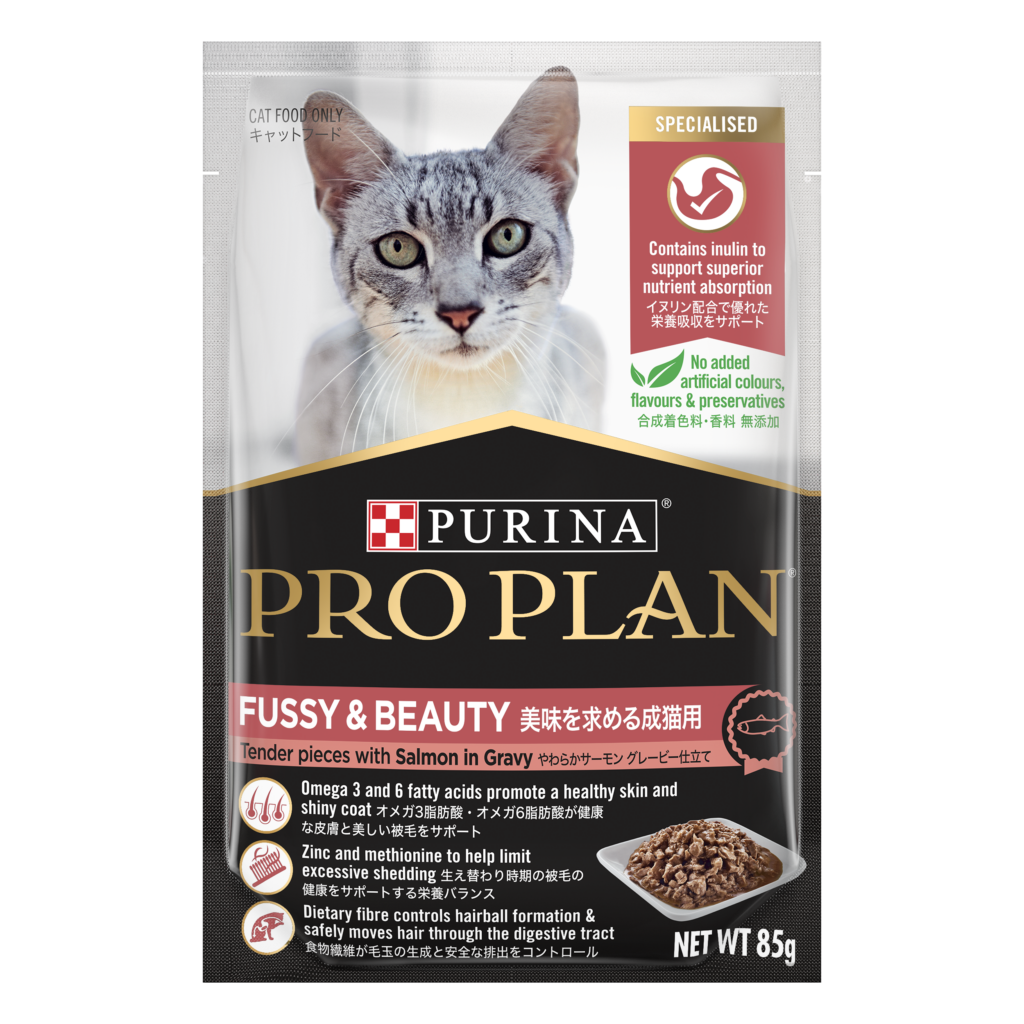 - 成貓美毛亮麗濕糧配方 (醬汁三文魚): 含菊糖、OMEGA 3 & 6 以及鋅和甲硫氨酸,煥發毛色光澤並控制掉毛。