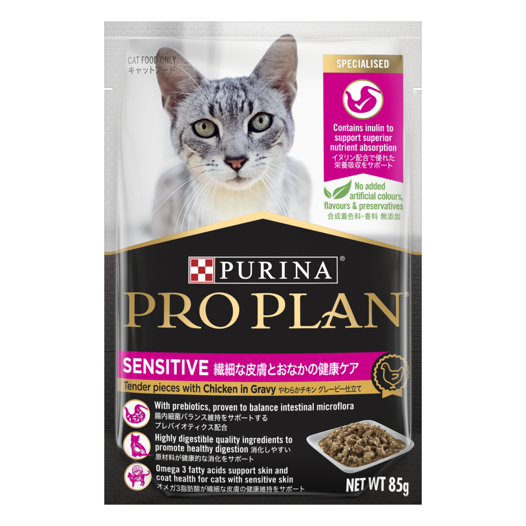- 成貓敏感濕糧配方 (醬汁雞肉): 含益生元促進益生菌生長,支持消化系統,配合 OMEGA 3 舒緩皮膚敏感。