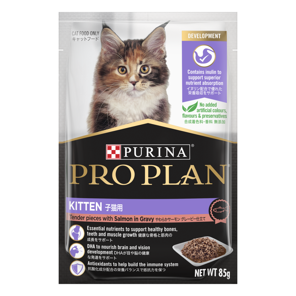 - 幼貓濕糧配方 (醬汁三文魚): 含菊糖促進吸收,DHA 助力腦部與視力發展,並有助骨骼、牙齒和肌肉健康。