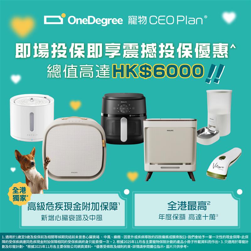 新一年想為毛孩提供最全面的保障?OneDegree 準備了全年最抵的投保優惠!凡於寵物節期間在 OneDegree 攤位(1E-C06)即場投保寵物 CEO Plan®,除了可享有激罕折扣外,更有機會獲得總值高達 HK$6,000 的驚喜禮品^!