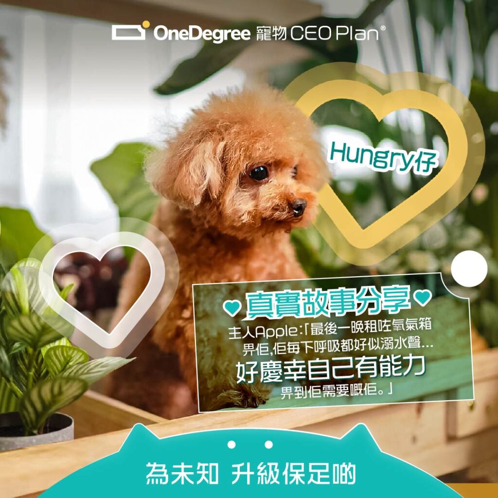 OneDegree寵物CEO Plan® 現已升級!除了提供全港最高¹的HK$100,000醫療保額並承諾終身續保²,更新增高級危疾現金附加保障³,若你的寵物首次確診罹患心臟衰竭、中風、 癲癇,或因意外或疾病導致四肢癱瘓或髕骨脫臼,寵物CEO Plan®將為你提供一次性現金HK$10,000元,為你減輕負擔。