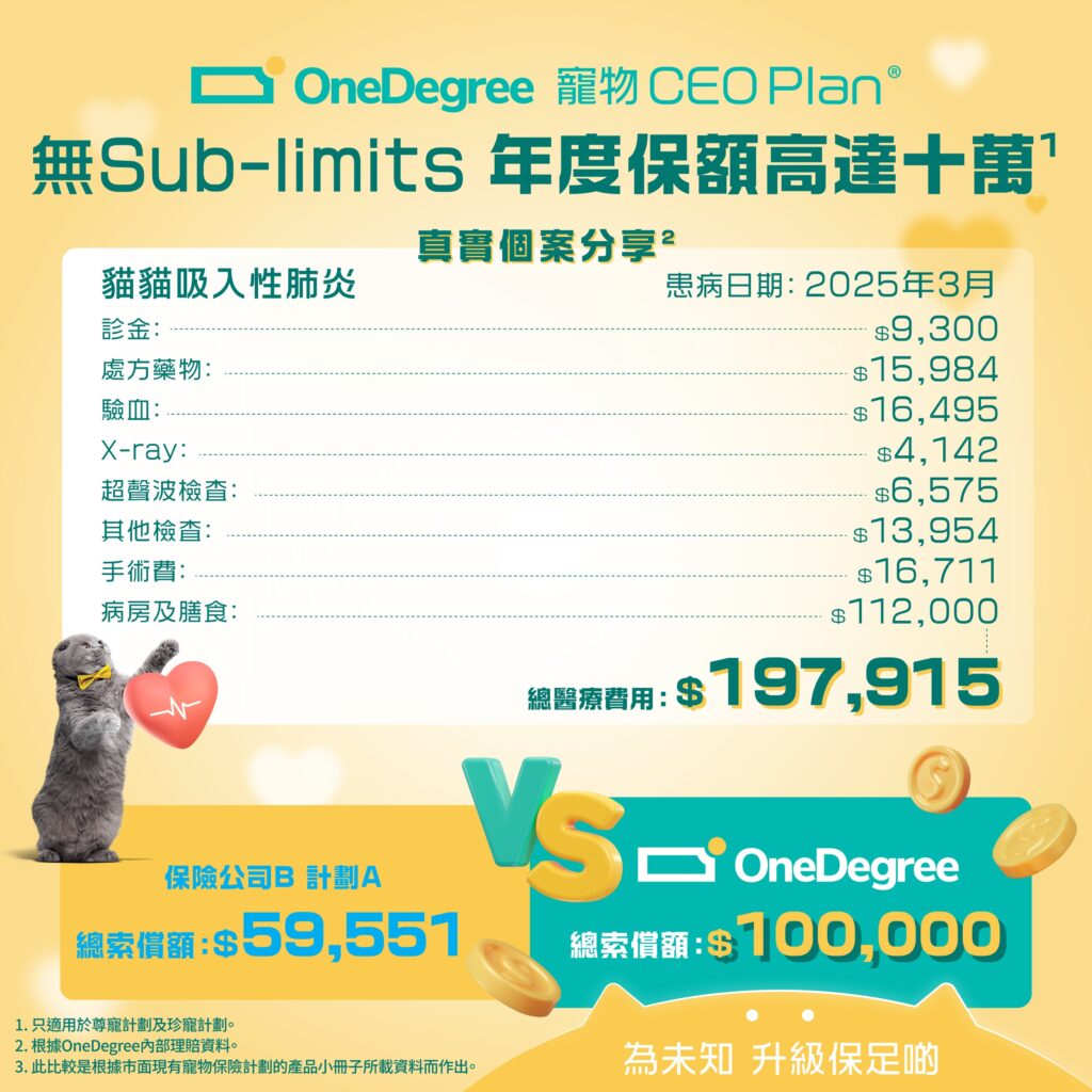 就以下真實個案為例——當毛孩住院費用達數萬元時,若計劃設有住院 sub-limit,主人最終可能只能索回一小部分費用。