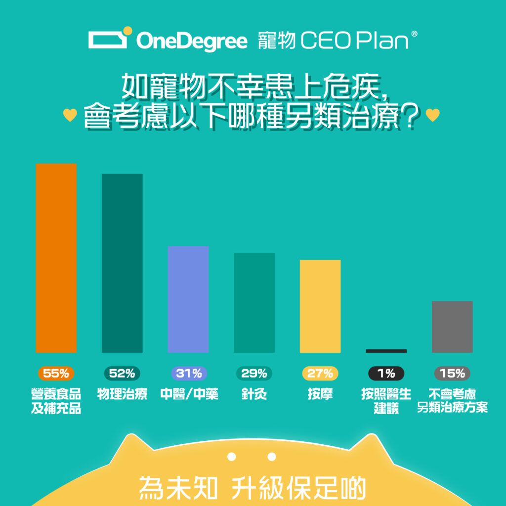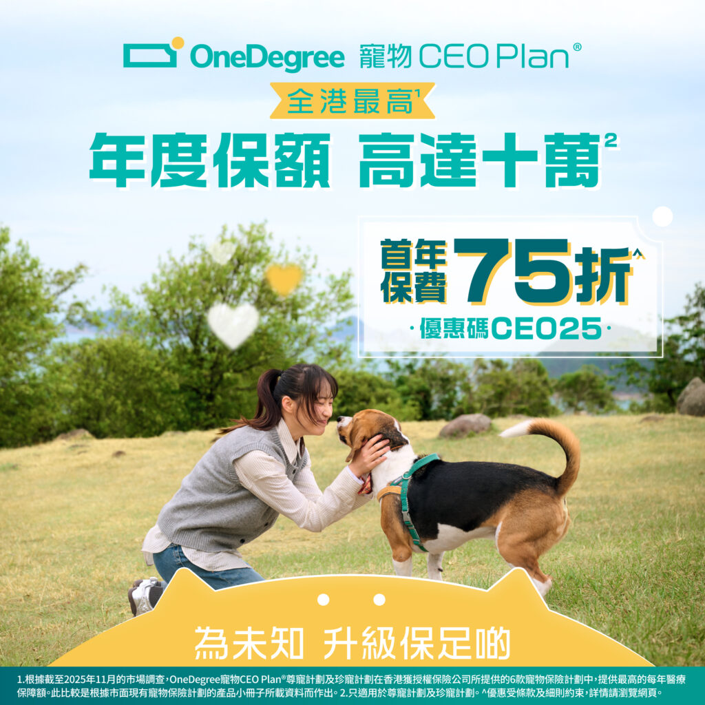 6. 根據截至2025年11月的市場調查,OneDegree寵物CEO Plan®尊寵計劃及珍寵計劃在香港獲授權保險公司所提供的6款寵物保險計劃中,提供最高的每年醫療保障額。此比較是根據市面現有寵物保險計劃的產品小冊子所載資料而作出。