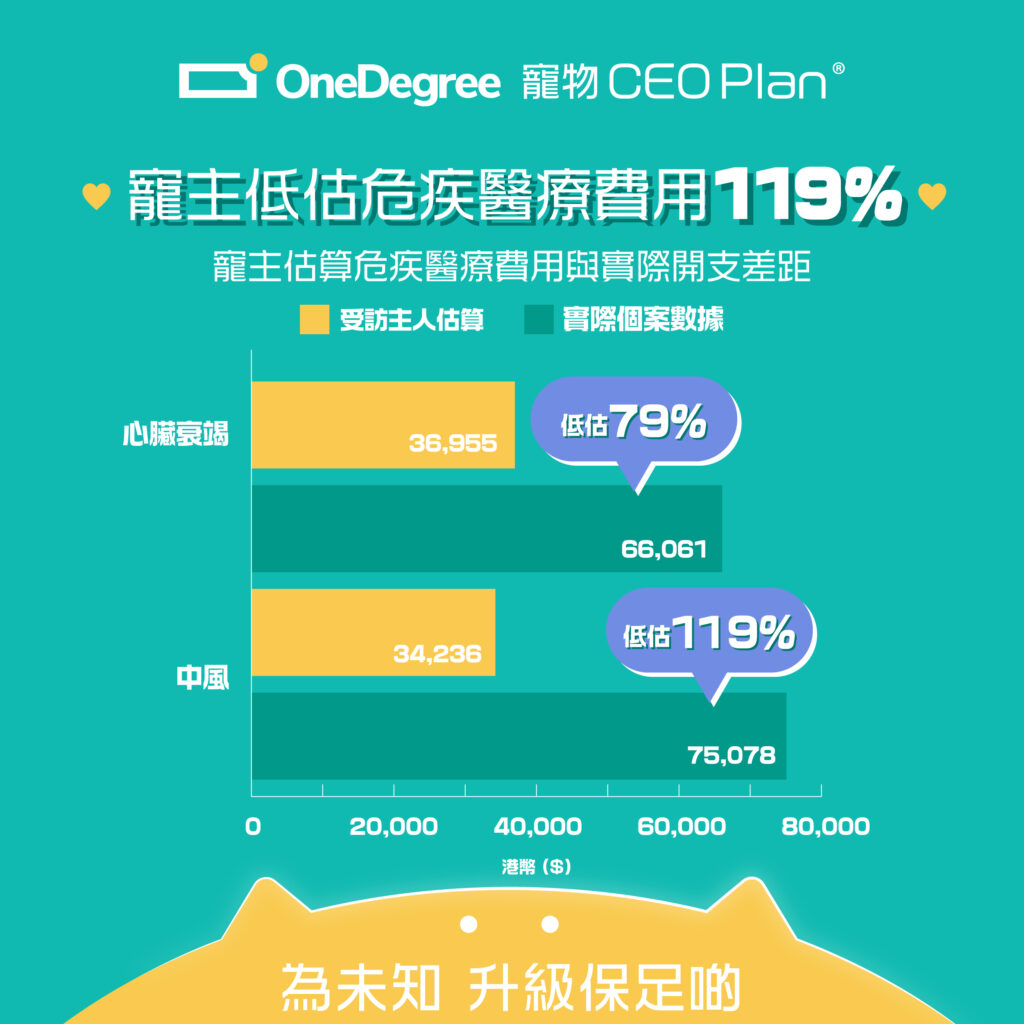 OneDegree寵物CEO Plan® 現已升級!除了提供全港最高⁶的HK$100,000醫療保額並承諾終身續保⁷,更新增高級危疾現金附加保障³,若你的寵物首次確診罹患心臟衰竭、中風、 癲癇,或因意外或疾病導致四肢癱瘓或髕骨脫臼,寵物CEO Plan®將為你提供一次性現金HK$10,000元,為你減輕負擔。