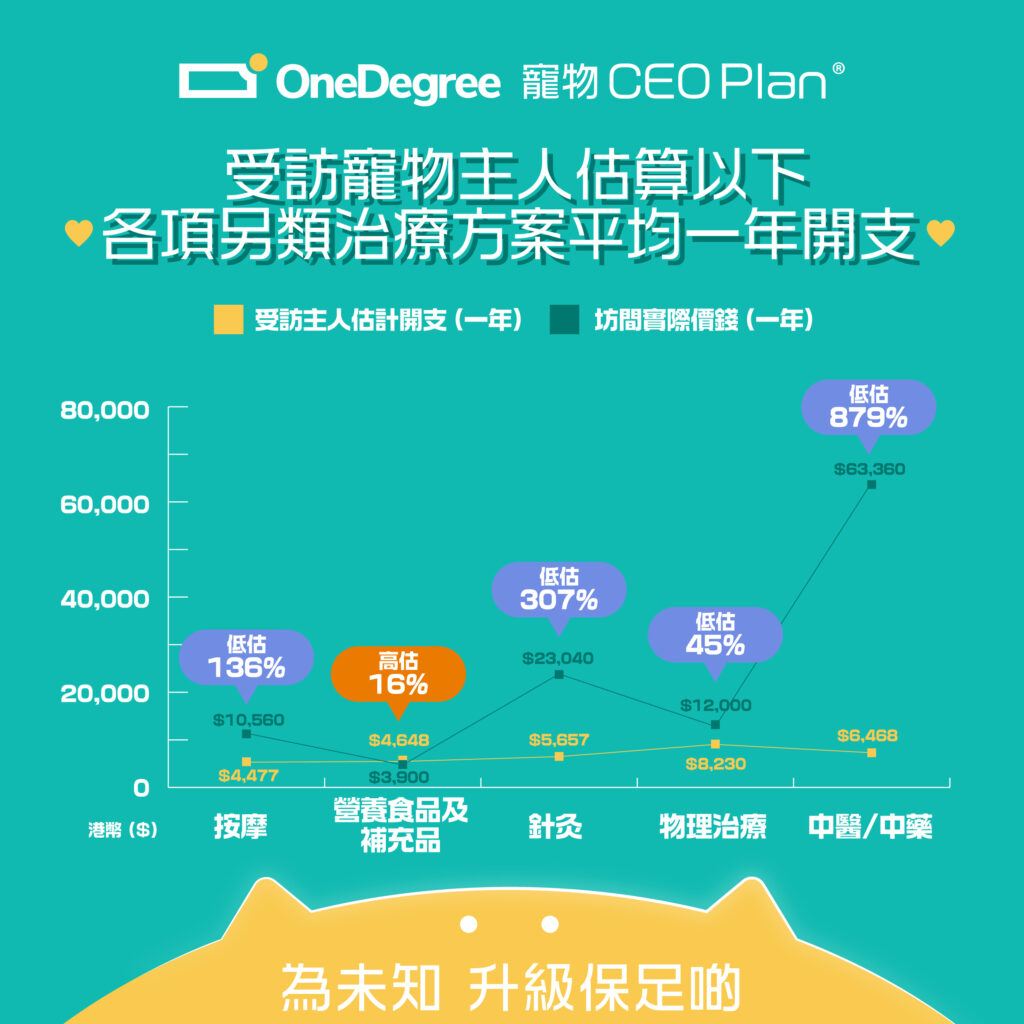 然而,寵主對這些「另類治療」的費用估算最為嚴重,低估了近9倍(879%)。這些治療通常需要長期進行,雖然單次費用看似不高,但累積下來的開支往往成為毛孩康復道路上的隱形財政壓力。
