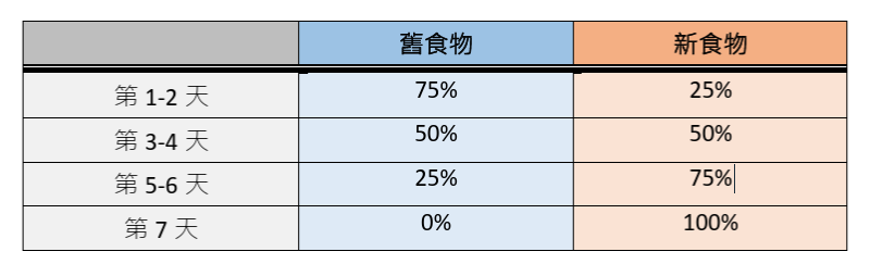 若需轉換新的寵物食品,指引建議以7天循序漸進過渡,首兩天以75%舊糧混入25%新糧,逐步調整至第七天完全改用新糧,以減少消化道不適。